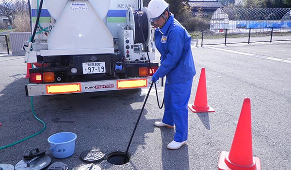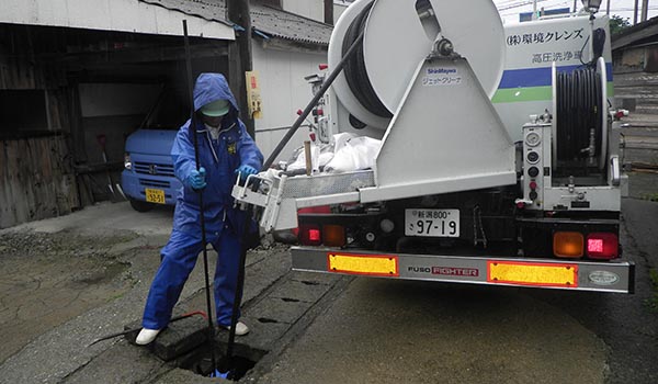 高圧洗浄車による目詰りした上下水道や排水管の洗浄、汚濁壁や大規模煙突、庭石や墓石等の汚れを高圧ジェット水流で洗浄します。
